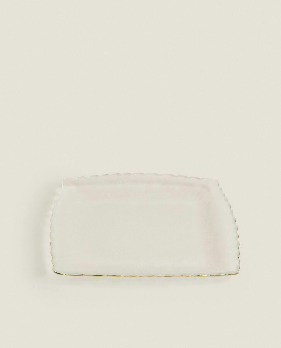 Quadratischer Dessertteller aus Glas mit gewelltem Rand und Goldrand, für Weihnachten.