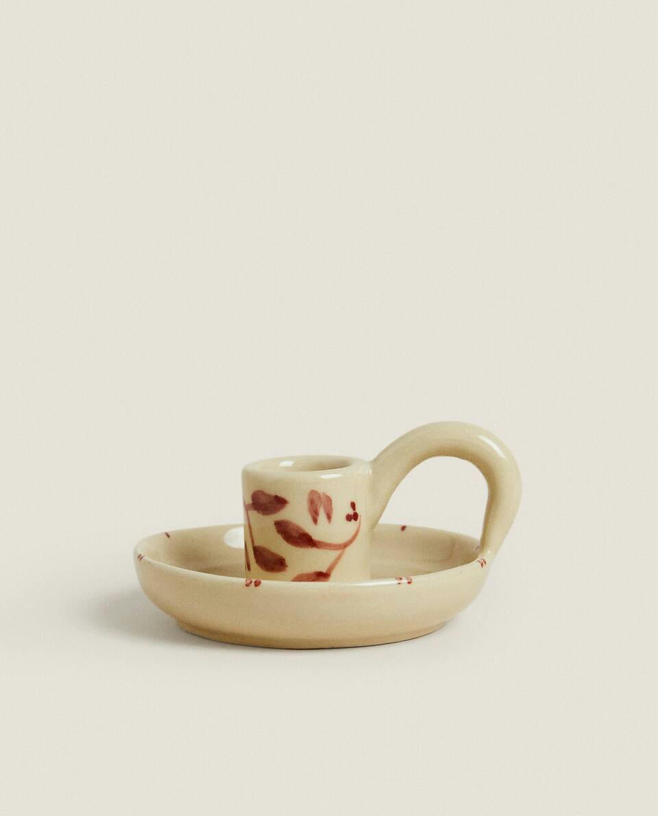 Ceramic candlestick with a handle and a round base with painted details, for Christmas.