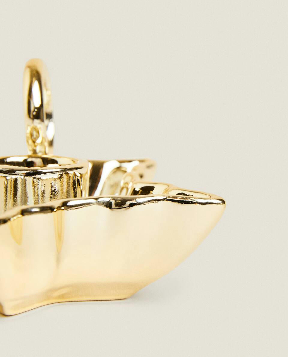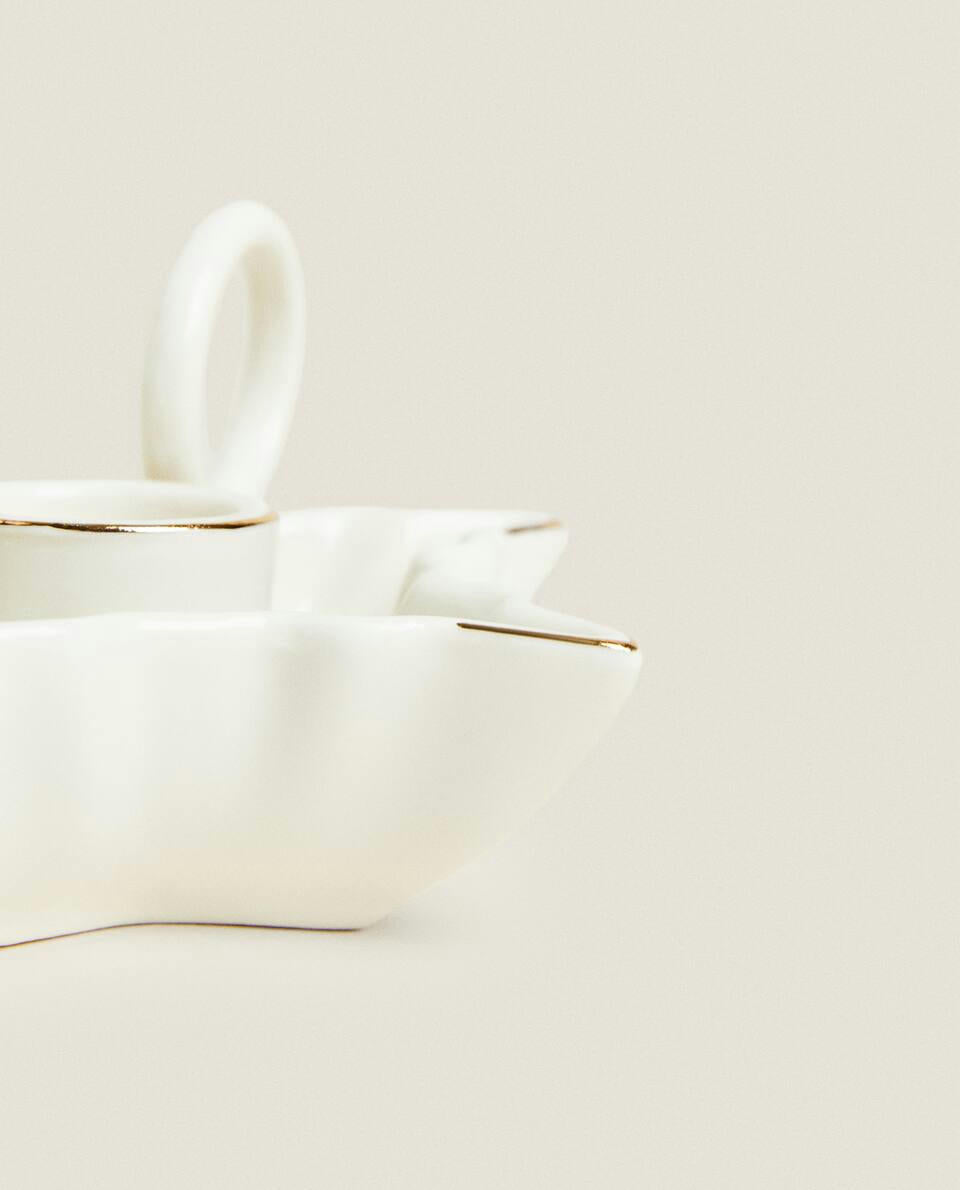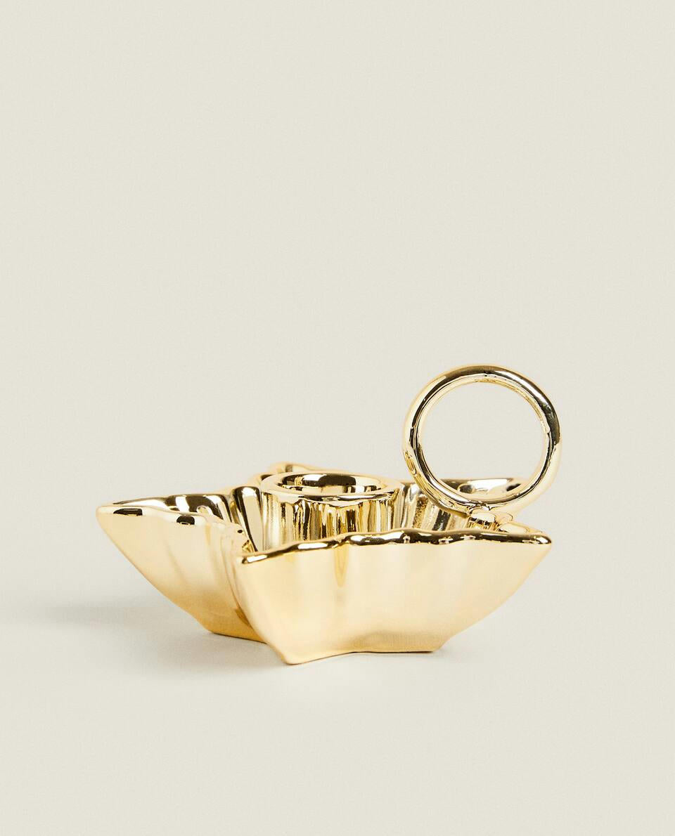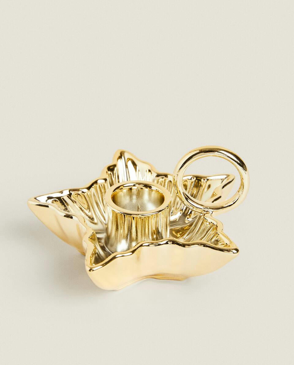 Porcelain candlestick with handle, featuring a star-shaped base with a gold rim, for Christmas.
