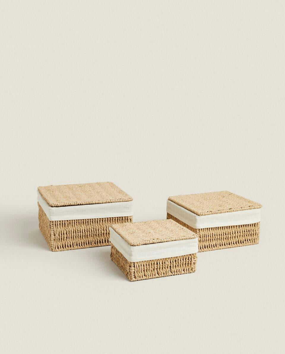 Basket featuring a square base, lid, metal structure covered in resilient paper, and linen and cotton lining.Removable and washable fabric lining.