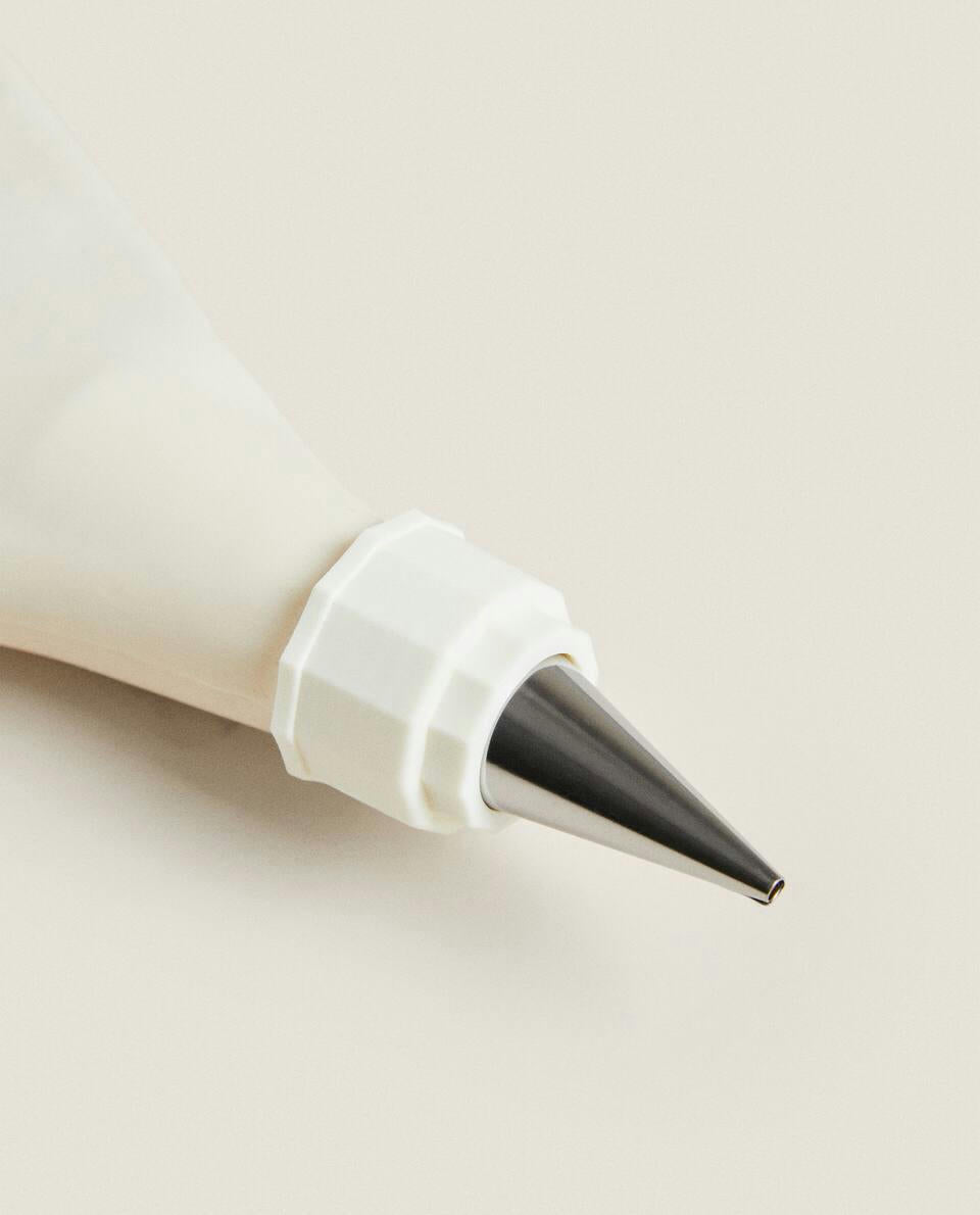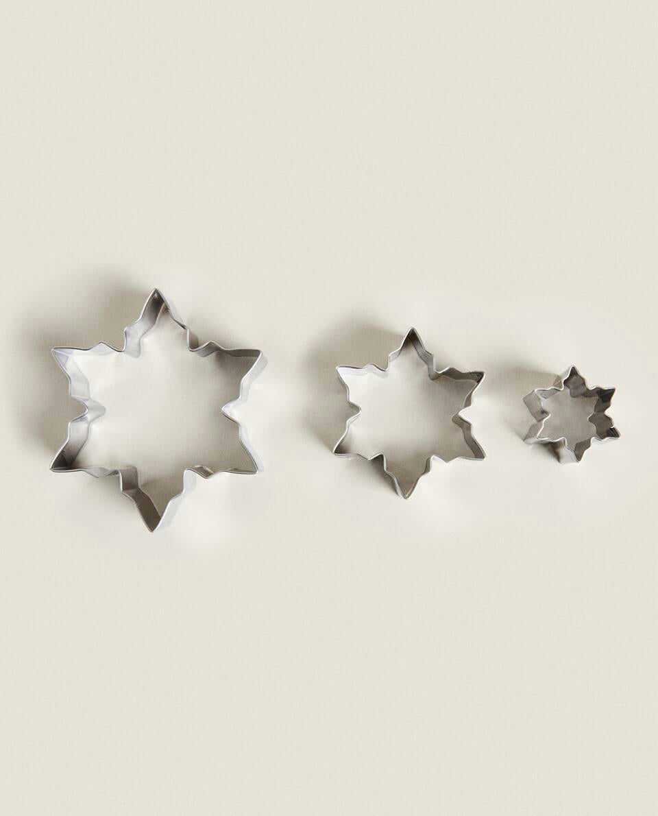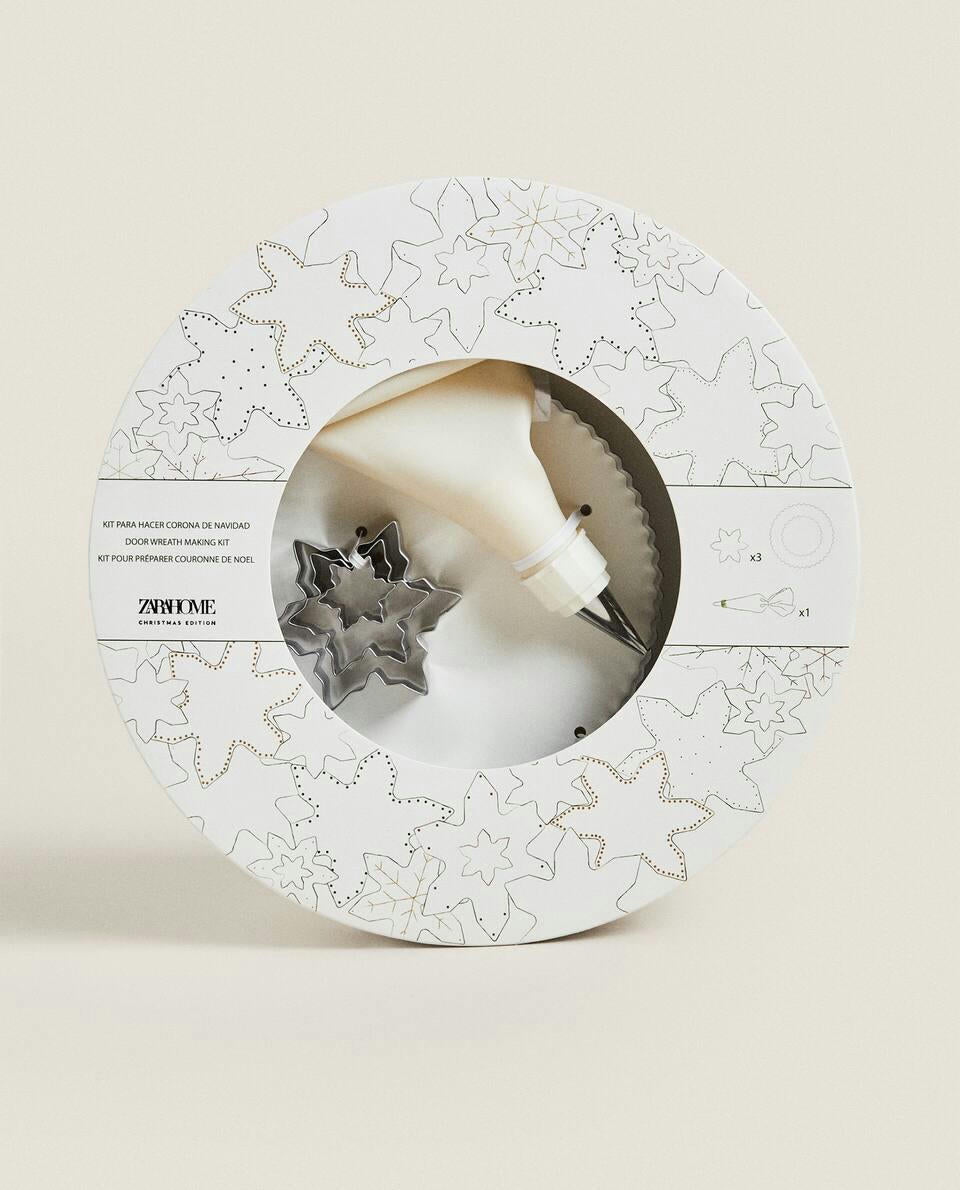 Baking kit with tools and utensils for making a Christmas ring cake.The kit includes: one piping bag, three leaf-shaped cookie cutters (each in a different size) and two round cutters with scalloped edge (each in a different size).