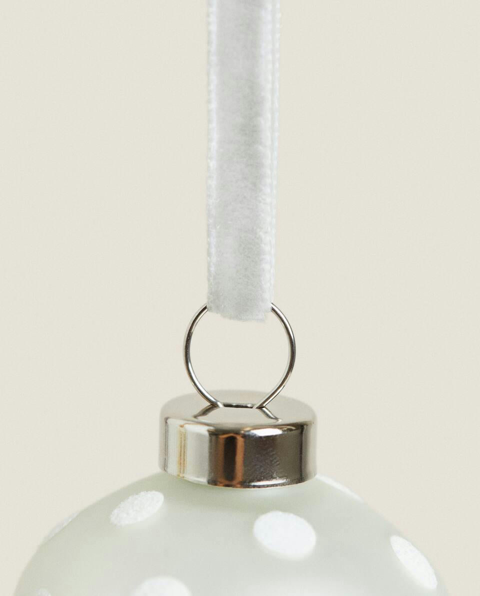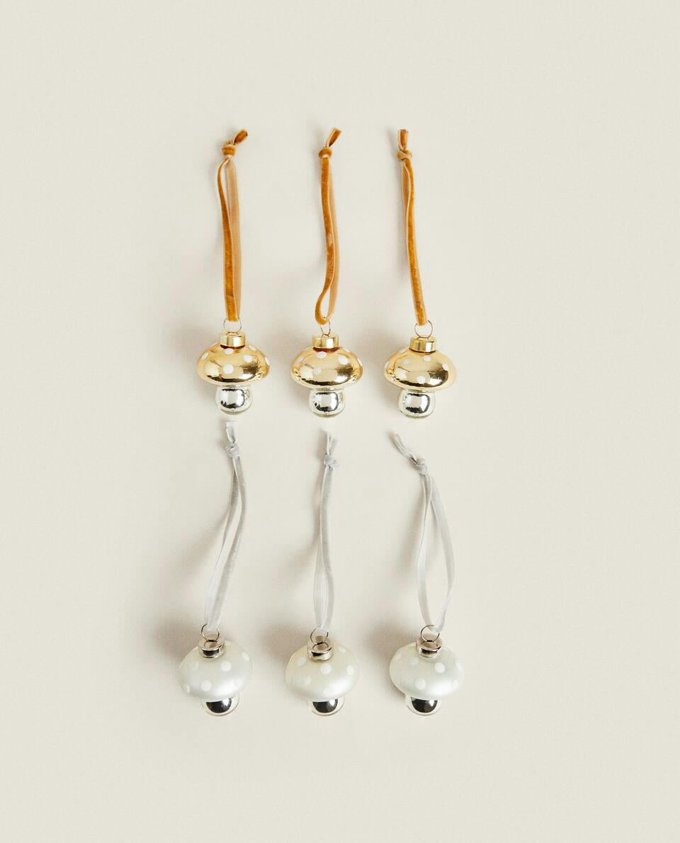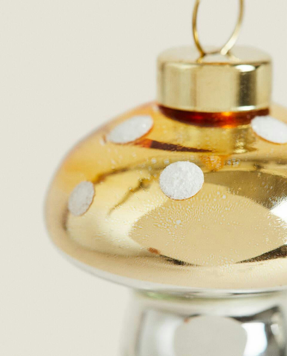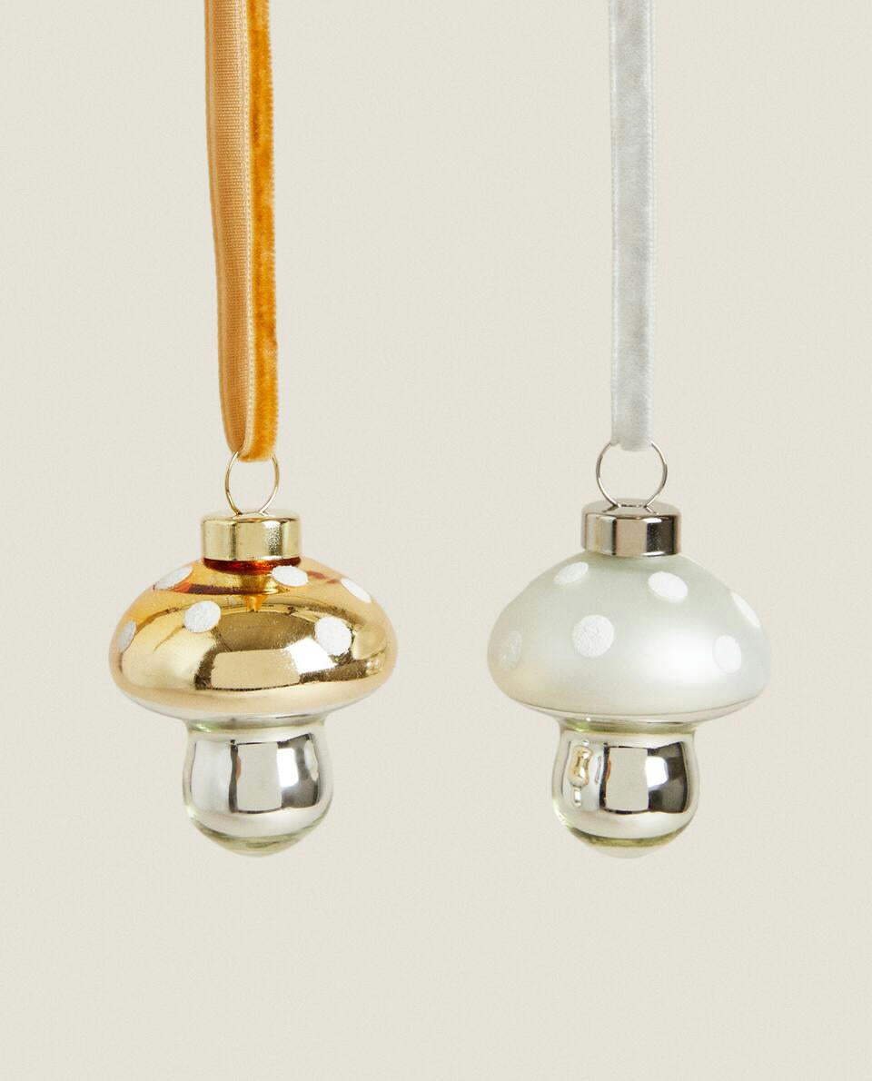 Christmas tree decoration in the shape of a mushroom made of glass, with a shiny finish and a velvet ribbon for hanging.Pack of 6 (3 of each colour).